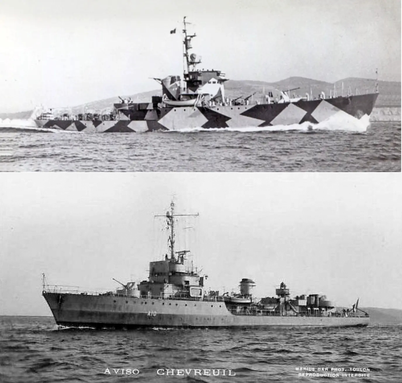 An Italian Gabbiano-class corvette top, French Chamois-class aviso sloop bottom, I cannot find photos of either Camoscio/UJ6081 or Amiral Senes/SG21 as both had a short career.