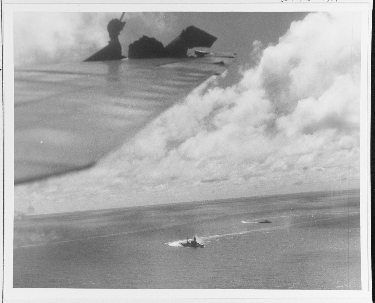 Japanese Ise class battleship and destroyer in action during the battle off Cape Engano, 25 October 1944. Photographed by a TBM from USS San Jacinto, note damaged wingtip on plane. 80-G-284705