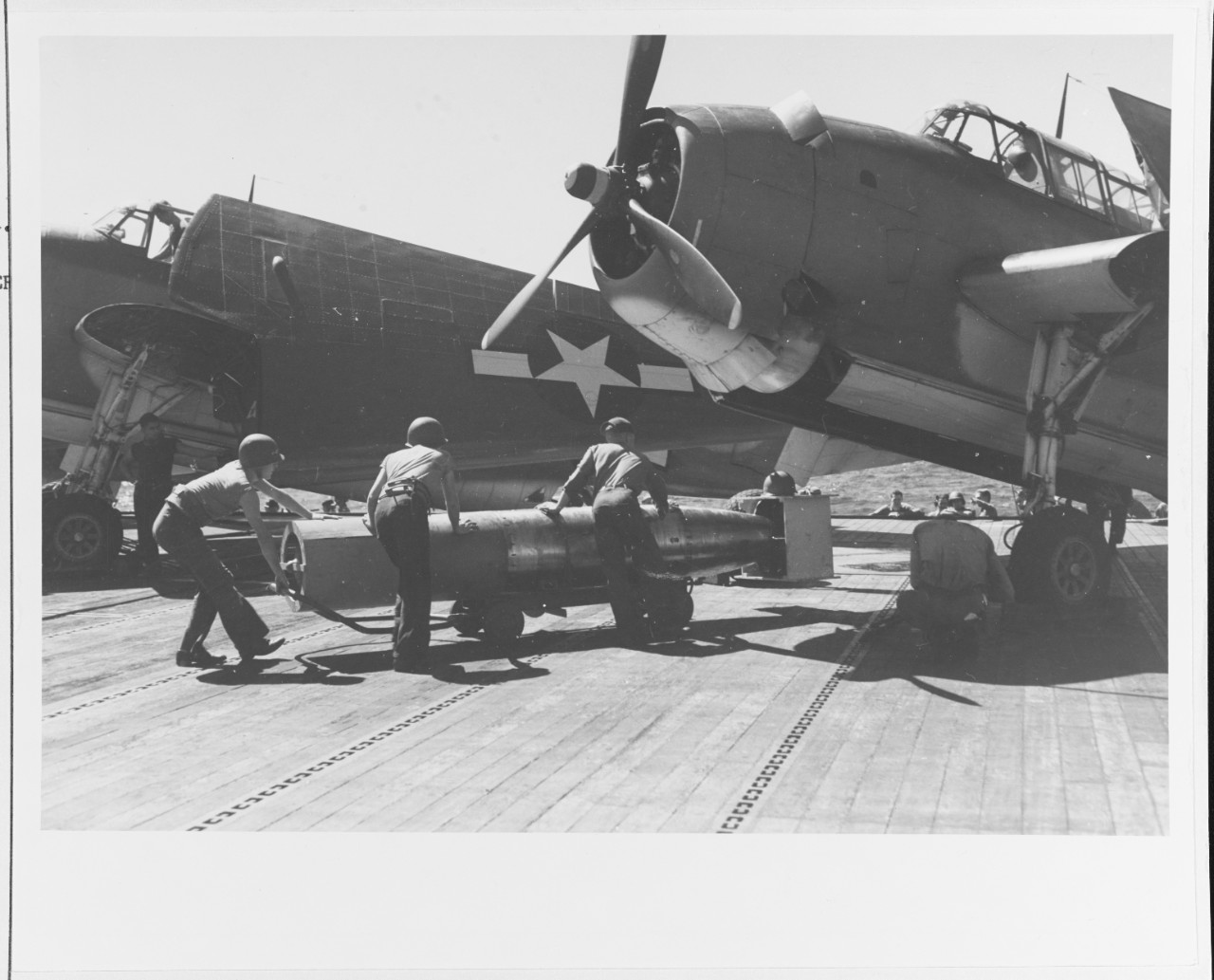 Battle off Cape Engaño, 25 October 1944. Arming a Torpedo Squadron 51 (VT-51) TBM torpedo bomber on USS San Jacinto (CVL-30). Probably taken before the squadron’s planes attacked the Japanese carrier force. The Torpedo is a Mark XIII, fitted with a wooden stabilizer around its tail and drag ring around its nose. 80-G-284708