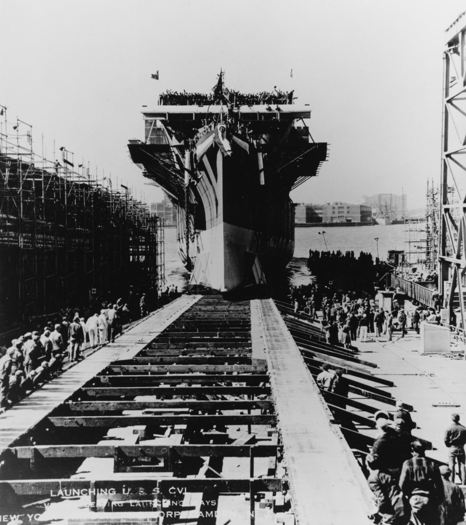 USS San Jacinto (CVL-30) sliding down the building ways at the New York Shipbuilding Corp. yard, Camden, New Jersey, after she was christened by Mrs. Jesse H. Jones, 26 September 1943. 80-G-44590