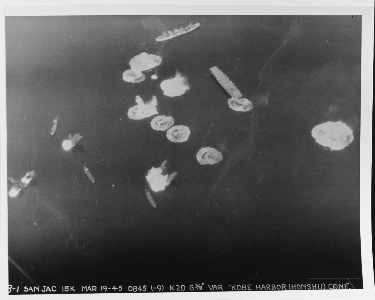Bombs fall near an enemy escort carrier and several small cargo ships, in Kobe Harbor, 19 March 1945. The CVE is probably the Shimane Maru. Taken from a USS San Jacinto plane. NH 95783