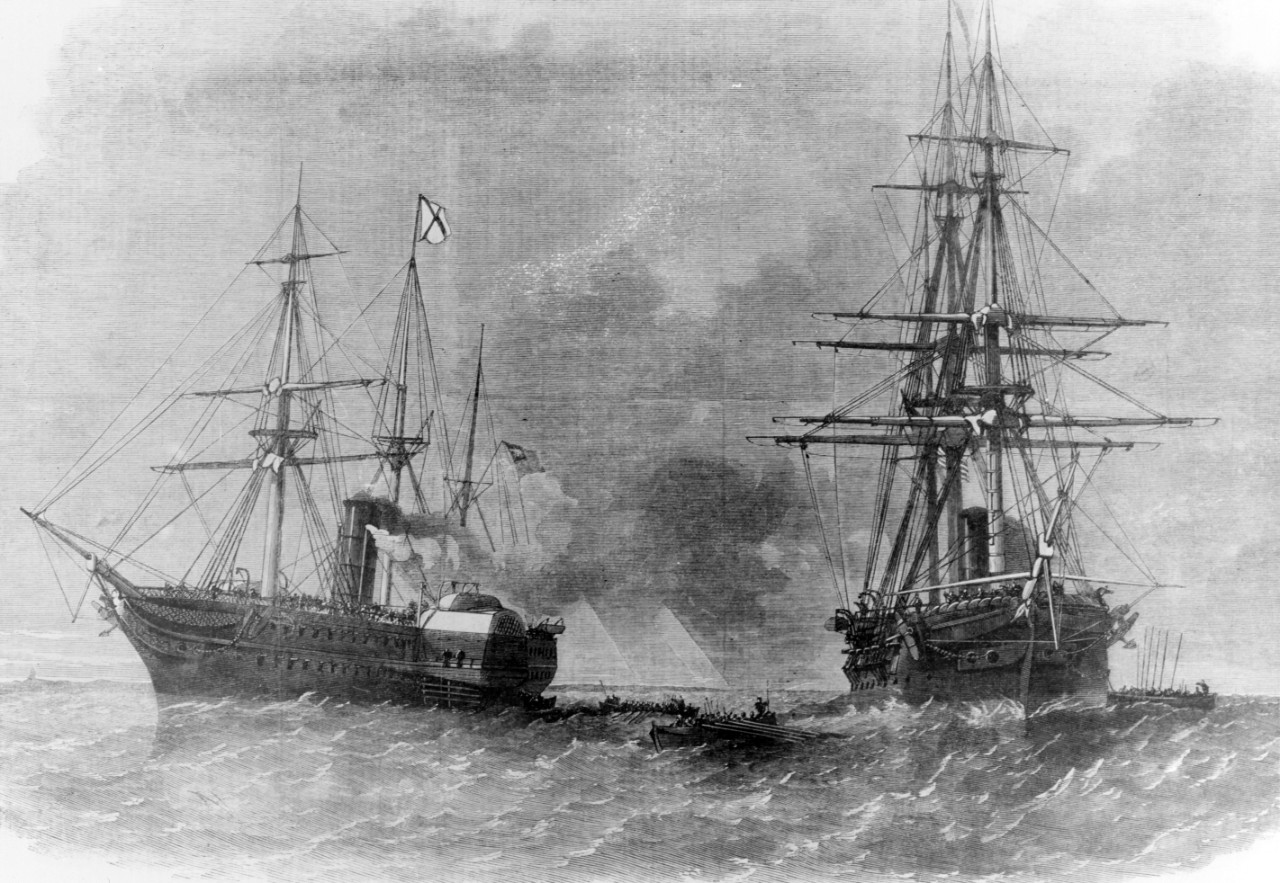 Trent Incident, 8 November 1861. USS San Jacinto removes Confederate commissioners Mason and Slidell from the British Mali steamer Trent, in the old Bahama channel. Hand-colored engraving from The Illustrated London News Supplement, 7 December 1861. NH 73990