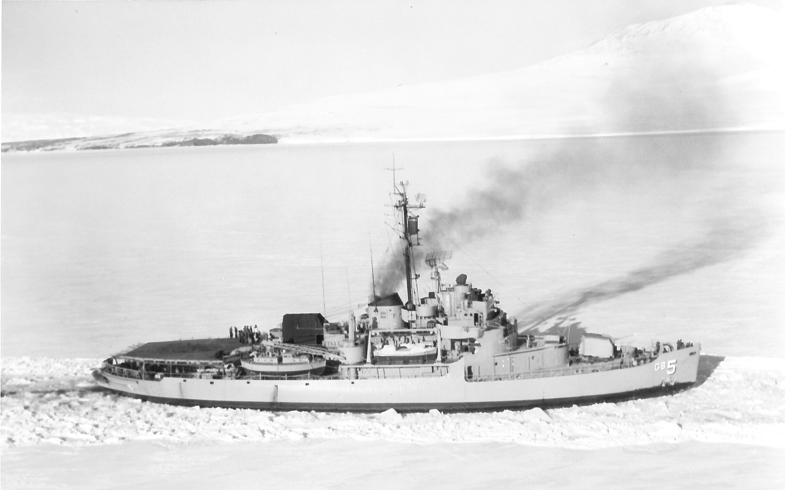 25 November 1962. Steaming past Antarctica’s only known active volcano, Mount Erebus, the Seattle-based icebreaker USS Staten Island (AGB-5) widens a channel in McMurdo Sound for trailing cargo ships en route to McMurdo Station Antarctica. U.S. Navy photo via USAP