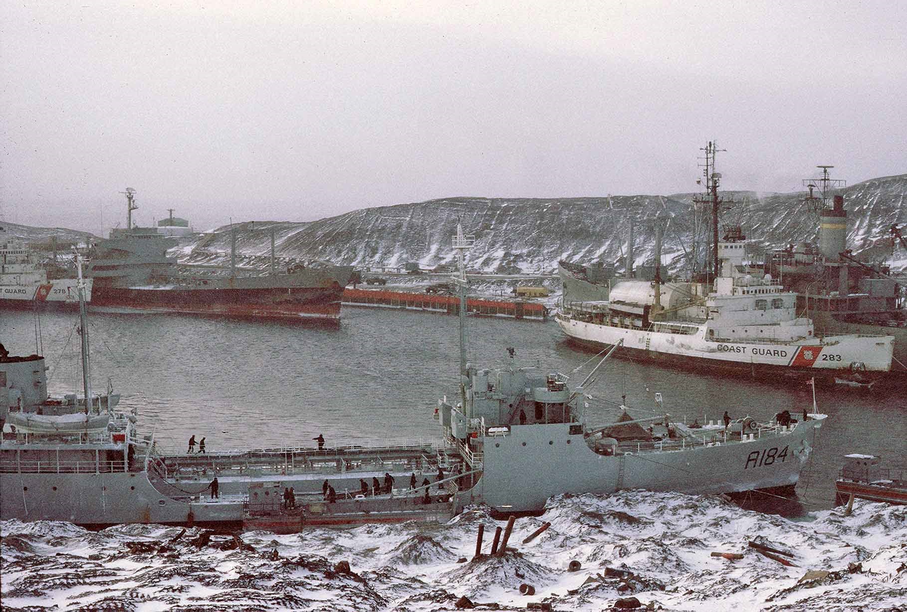 Five ships in Winter Quarters Bay on 13 February 1971. In the foreground is HMNZS Endeavour (A184), across right is USNS Wyandot (T-AKA-92) and USCGC Burton Island (WAGB-283), across left, is USNS Maumee (T-AO-149) and USCGC Staten Island (WAGB-278). Along the shoreline, work is underway to repair and install facing an Elliott Quay – a steel-and-timber reinforcement barrier to protect the shoreline from erosion. Photo by Carl Norton, via USAP