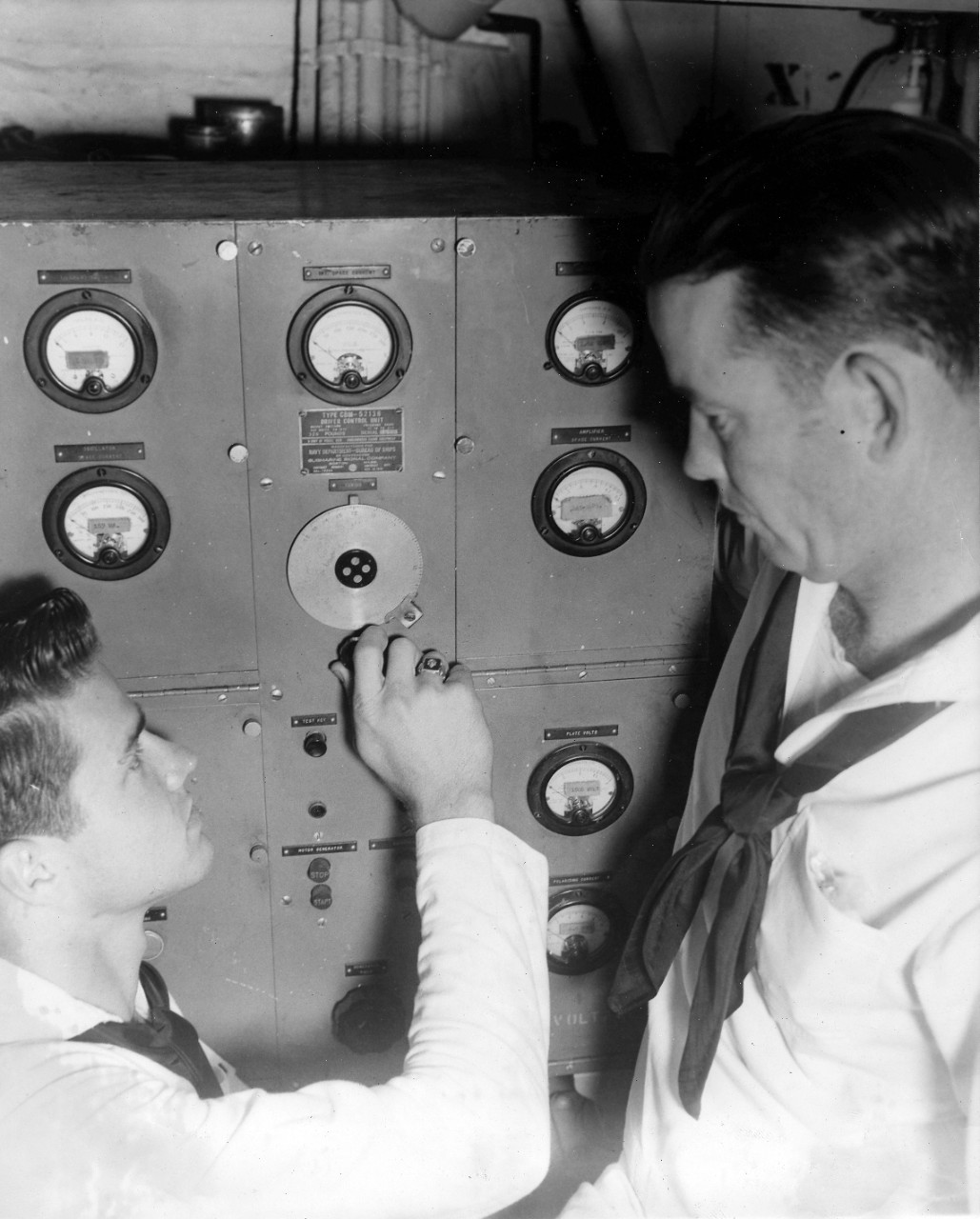 Undergoing a course of instruction with Naval sonar equipment aboard the USS PC 592 are two Naval Reservists, Seaman First Class F.C. Semkin and Apprentice Seaman G.S. Jackson, Naval Base, SC. Accession #: L55-03