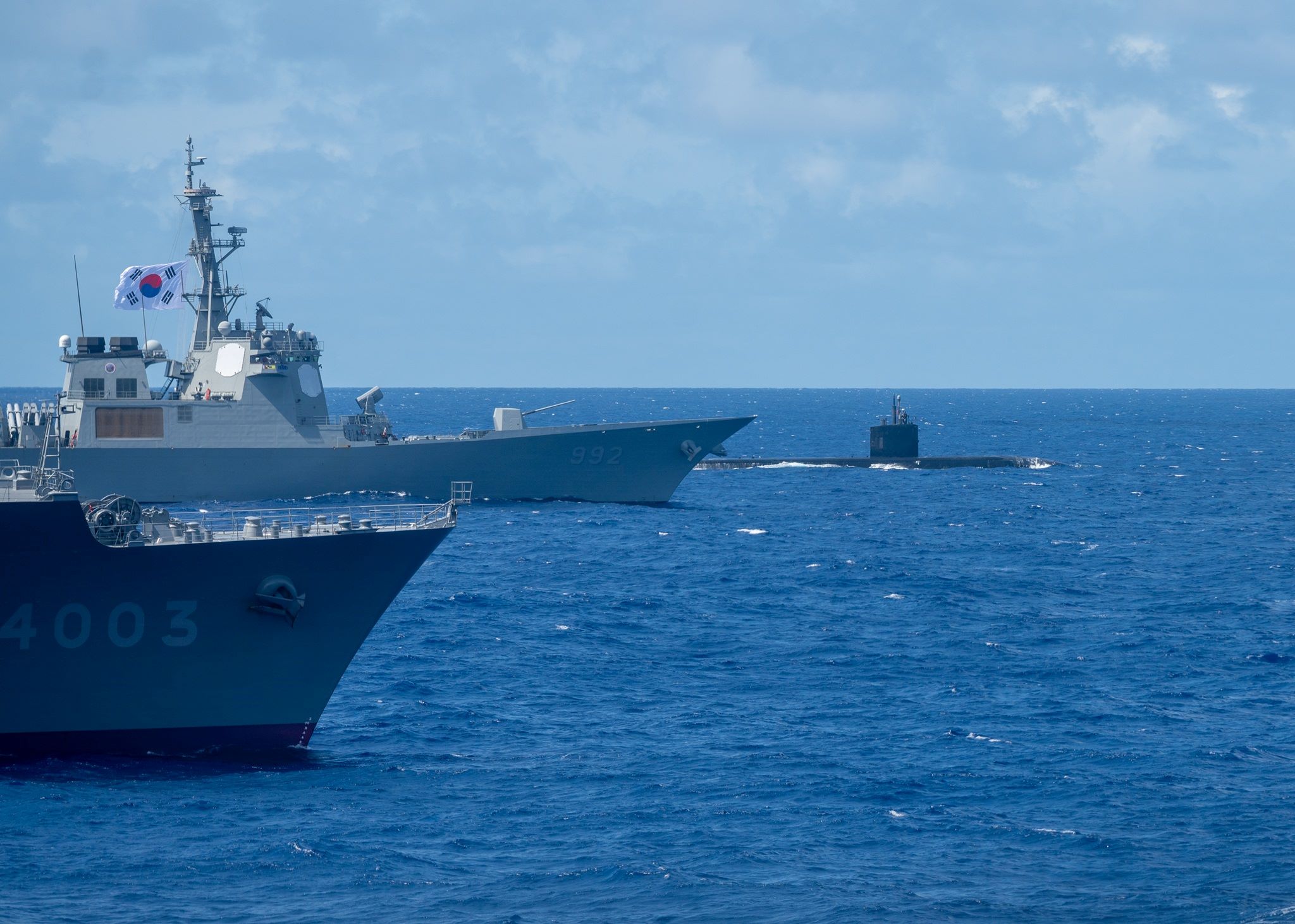 Japan Maritime Self-Defense Force amphibious transport dock ship JS Kunisaki (LST 4003), South Korean Navy destroyer ROKS Yulgok Yi I (DDG 992), and the Virginia-class submarine USS North Carolina (SSN 777) along with other multinational ships sail in formation off the coast of Hawaii during Exercise Rim of the Pacific (RIMPAC) 2024, July 22. Twenty-nine nations, 40 surface ships, three submarines, 14 national land forces, more than 150 aircraft and 25,000 personnel are participating in RIMPAC in and around the Hawaiian Islands, June 27 to Aug. 1. The world’s largest international maritime exercise, RIMPAC provides a unique training opportunity while fostering and sustaining cooperative relationships among participants critical to ensuring the safety of sea lanes and security on the world’s oceans. RIMPAC 2024 is the 29th exercise in the series that began in 1971. (U.S. Navy photo by Mass Communication Specialist 1st Class R. Ezekiel Duran)