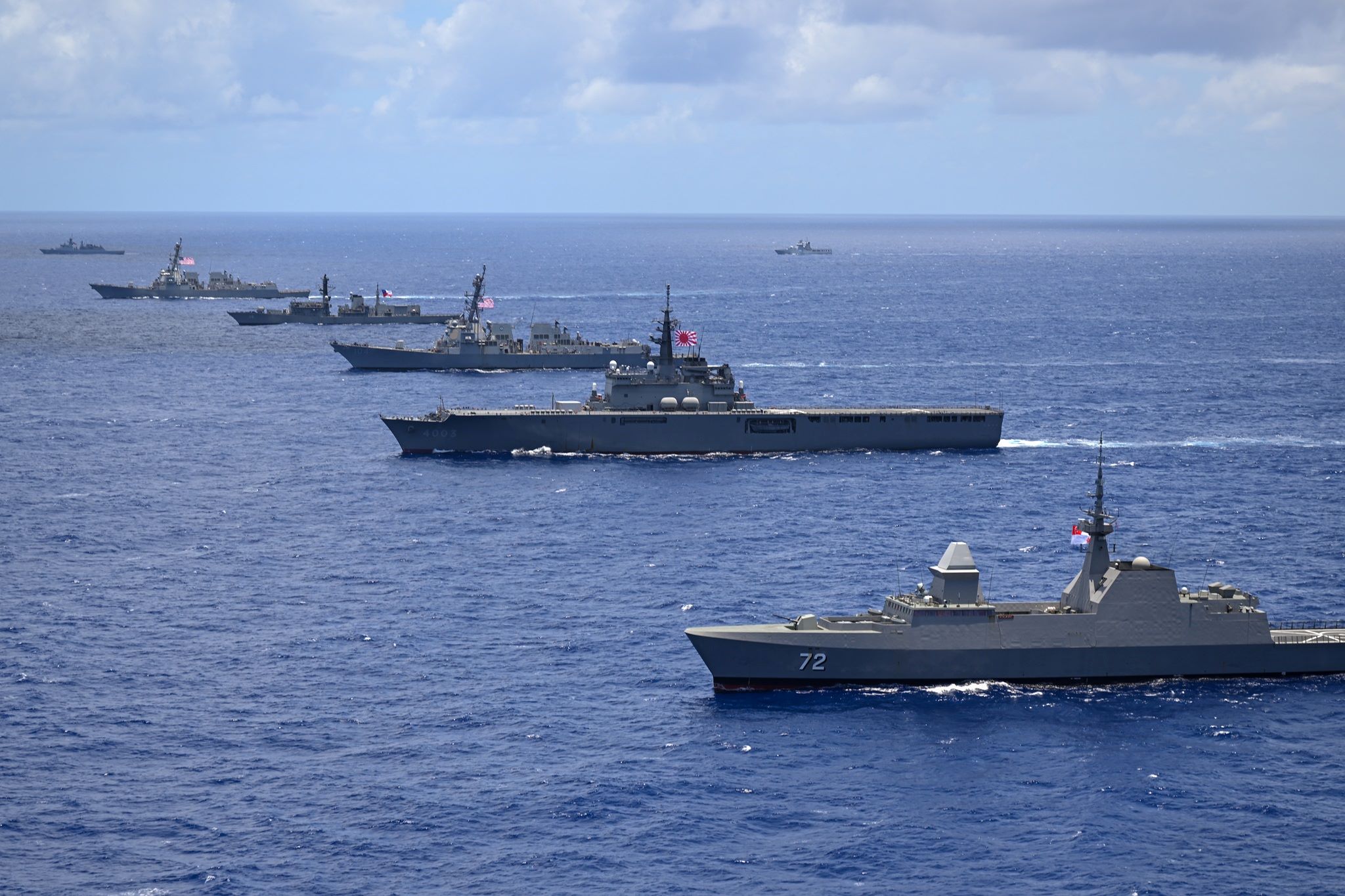 Multinational ships sail in formation July 22, off the coast of Hawaii during Exercise Rim of the Pacific (RIMPAC) 2024. Twenty-nine nations, 40 surface ships, three submarines, 14 national land forces, more than 150 aircraft and 25,000 personnel are participating in RIMPAC in and around the Hawaiian Islands, June 27 to Aug. 1. The world’s largest international maritime exercise, RIMPAC provides a unique training opportunity while fostering and sustaining cooperative relationships among participants critical to ensuring the safety of sea lanes and security on the world’s oceans. RIMPAC 2024 is the 29th exercise in the series that began in 1971. (U.S. Air Force photo by Master Sgt. Corban Lundborg)