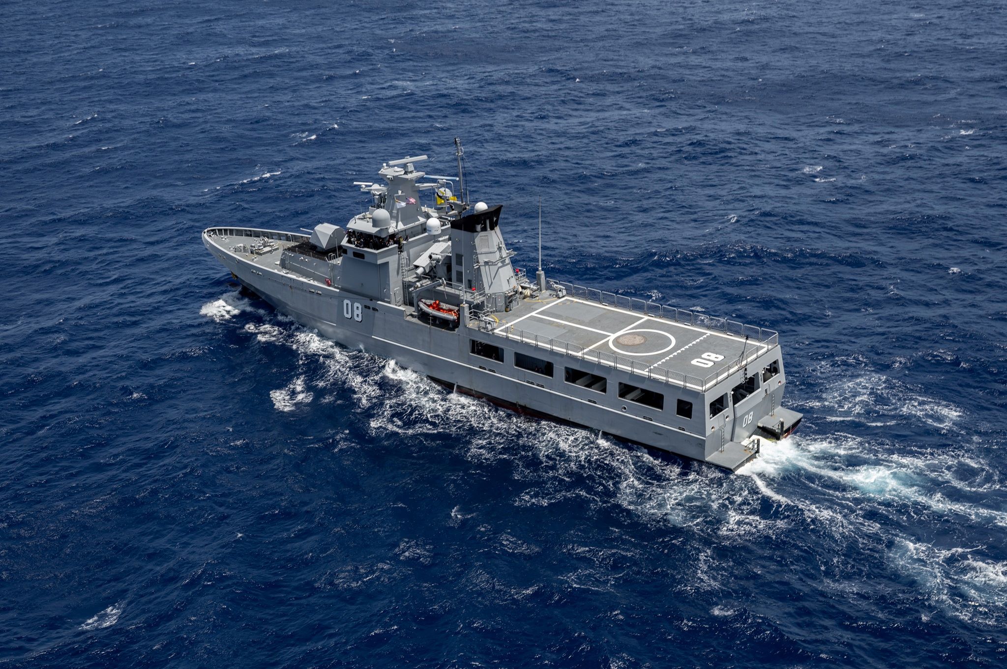 Royal Brunei Navy offshore patrol vessel KDB Darulaman (OPV 08) sails in formation off the coast of Hawaii during Exercise Rim of the Pacific (RIMPAC) 2024, July 22. Twenty-nine nations, 40 surface ships, three submarines, 14 national land forces, more than 150 aircraft and 25,000 personnel are participating in RIMPAC in and around the Hawaiian Islands, June 27 to Aug. 1. The world’s largest international maritime exercise, RIMPAC provides a unique training opportunity while fostering and sustaining cooperative relationships among participants critical to ensuring the safety of sea lanes and security on the world’s oceans. RIMPAC 2024 is the 29th exercise in the series that began in 1971. (U.S. Navy photo by Mass Communication Specialist 1st Class John Bellino)