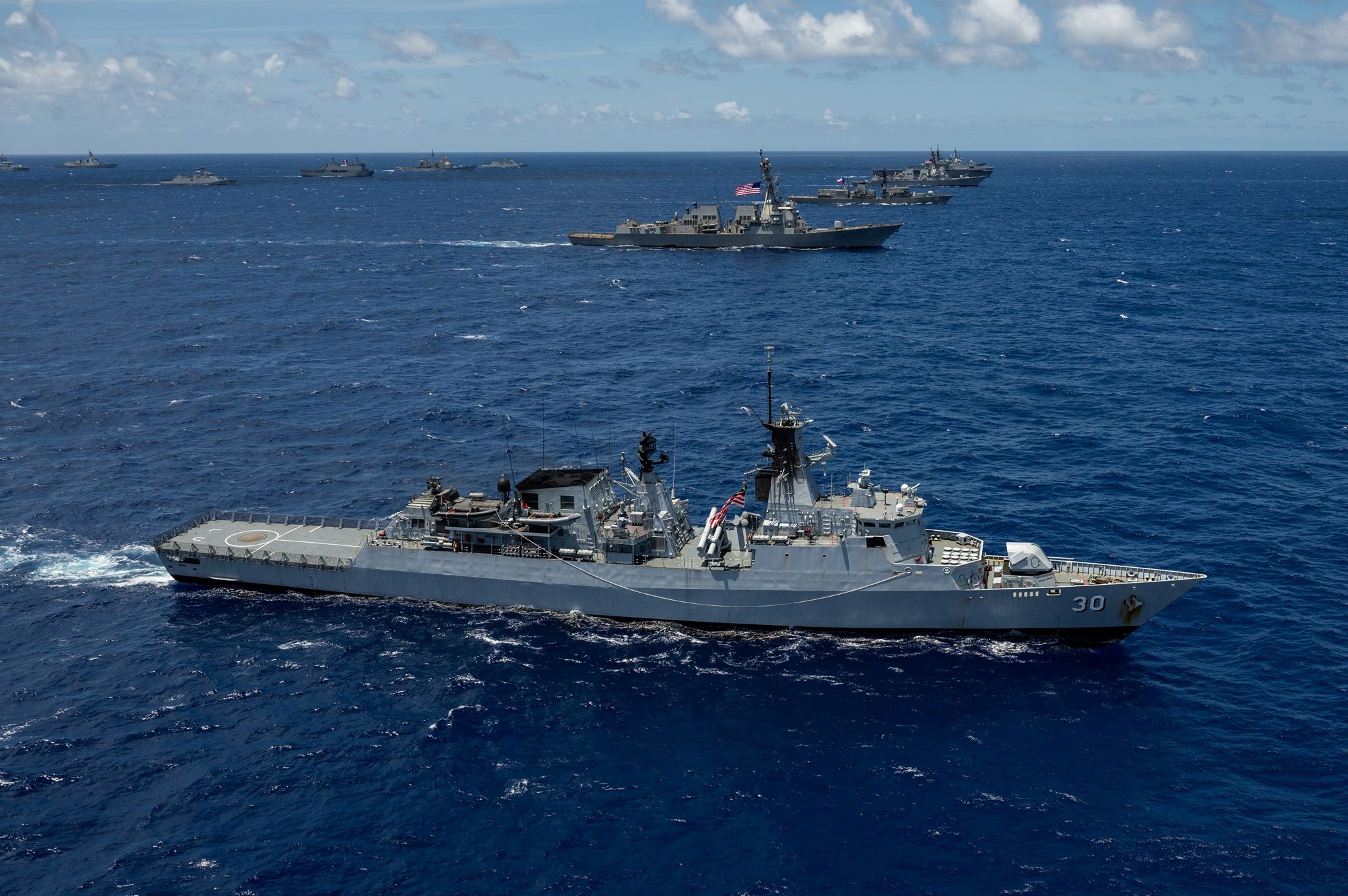 Royal Malaysian Navy frigate KD Lekiu (FFGH 30) sails in formation, off the coast of Hawaii during Exercise Rim of the Pacific (RIMPAC) 2024, July 22,. Twenty-nine nations, 40 surface ships, three submarines, 14 national land forces, more than 150 aircraft and 25,000 personnel are participating in RIMPAC in and around the Hawaiian Islands, June 27 to Aug. 1. The world’s largest international maritime exercise, RIMPAC provides a unique training opportunity while fostering and sustaining cooperative relationships among participants critical to ensuring the safety of sea lanes and security on the world’s oceans. RIMPAC 2024 is the 29th exercise in the series that began in 1971. (U.S. Navy photo by Mass Communication Specialist 1st Class John Bellino)