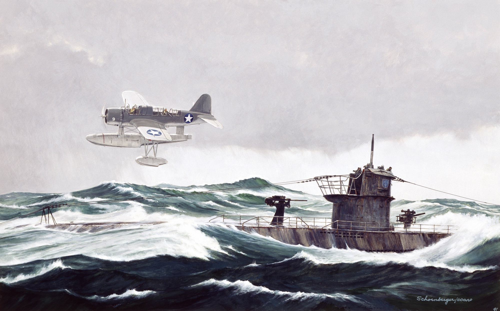 “Achtung! Achtung!” by George Schoenberger: A Coast Guard OS2U-3 Kingfisher patrol, plane surprises a German U-boat on the surface off the Atlantic Coast during World War II. The submarine is waiting for stragglers from a convoy just over the horizon. U.S. Coast Guard Art Program Collection