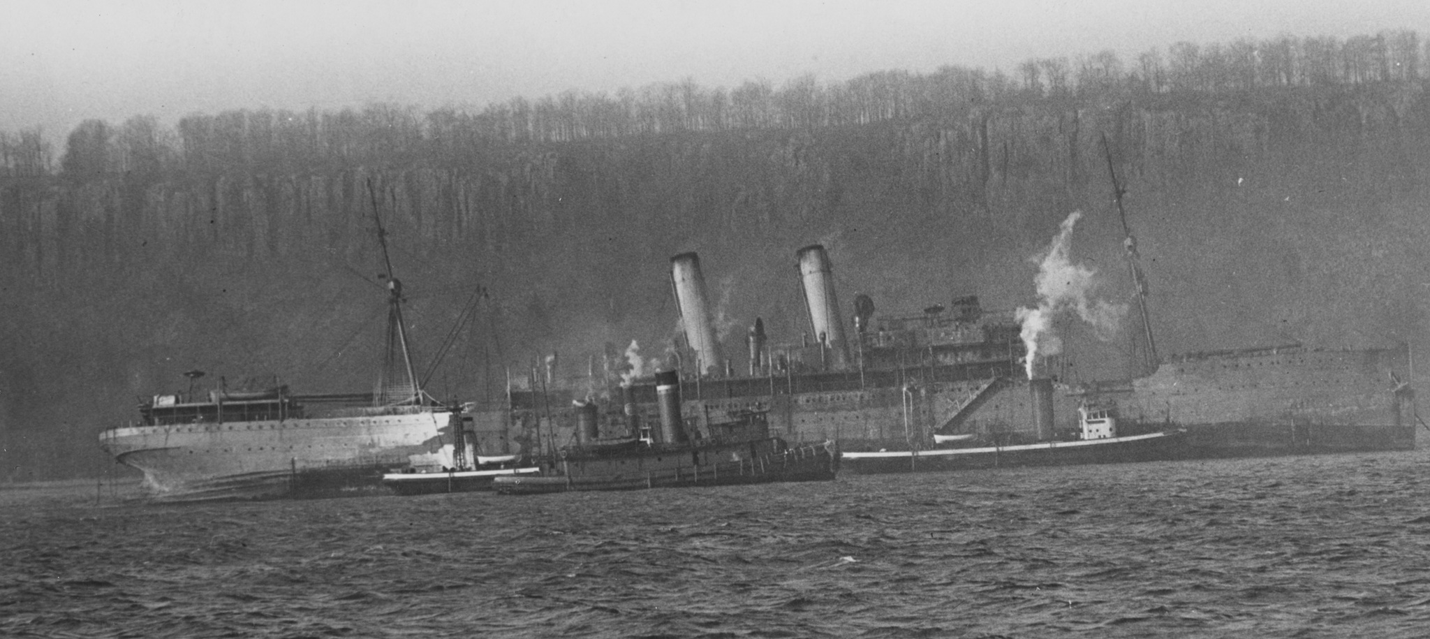 SS DeKalb in the Hudson River near Sputtan Duyvill Creek, on 16 December 1919, after she had been damaged by fire. The fire broke out while the ship was lying ready to be converted to an oil burner for the South American trade. Her skeleton crew of 35 men was removed safely and the vessel beached. NH 54663