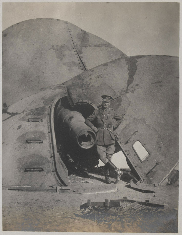 British Major-General Nathaniel Barnardiston next to a wrecked gun at Fort C, Tsingtao, November 1914. Barnardiston commanded the 1,500 British troops (2nd Battalion The South Wales Borderers and a detachment of the 36th Sikhs) sent to assist the 20,000 Japanese soldiers under General Kamio Mitsuomi in capturing Germany’s naval base at Tsingtao (Qingdao) in China. The port fell to the Allies on 7 November 1914. NAM. 1969-06-31-53