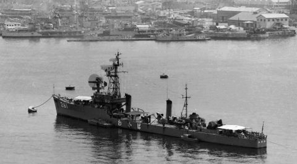 JMSDF Wakaba class escort (DE261) Wakaba (exIJN Matsu Tachibana class destroyer Nashi) at Uraga ship yard,1 Apr. 1962