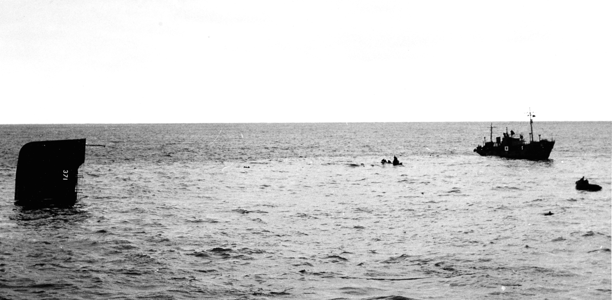 USS Minivet (AM-371) sinking after hitting a mine off Tsushima Island, Japan, during mine clearance operations on 29 December 1945. At right is a Japanese mine-destructor trawler moving in to rescue survivors. Photographed from USS Redstart (AM-378). 80-G-607204