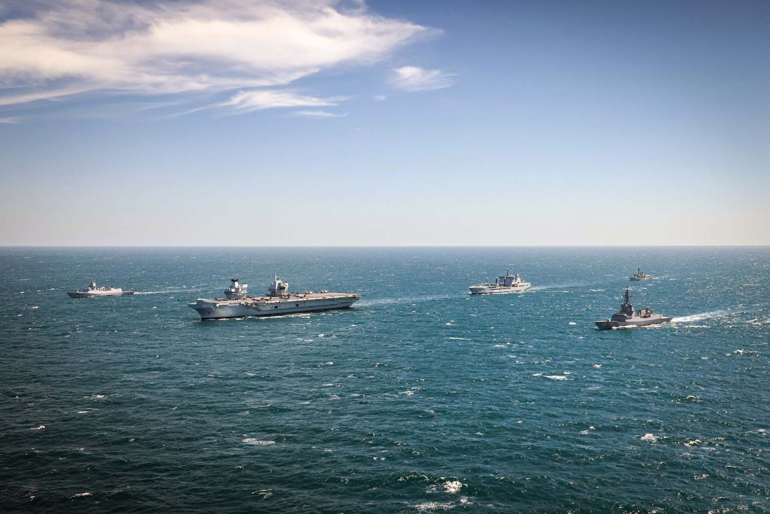 Left to right: Norwegian warship HNoMS Roald Amundsen, HMS Prince of Wales, RFA Tidespring, Australian warship HMAS Sydney, HMS Richmond.