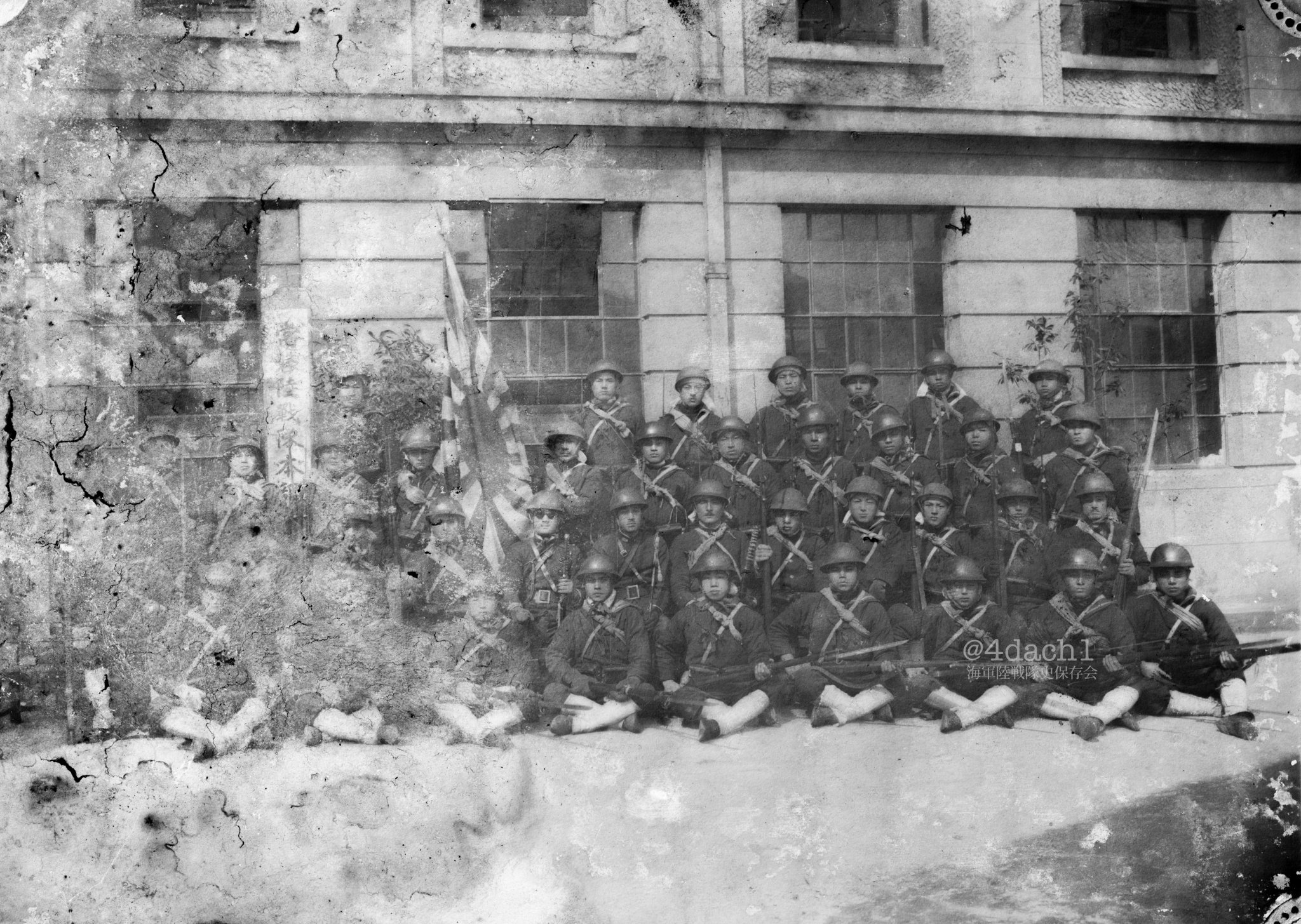 Cruiser Tokiwa Rikusentai 2nd Co Cmd Plat in front of the Japanese Middle School (their HQ) on Range Rd, Shanghai, February 11th, 1932 photo by Austin Adachi