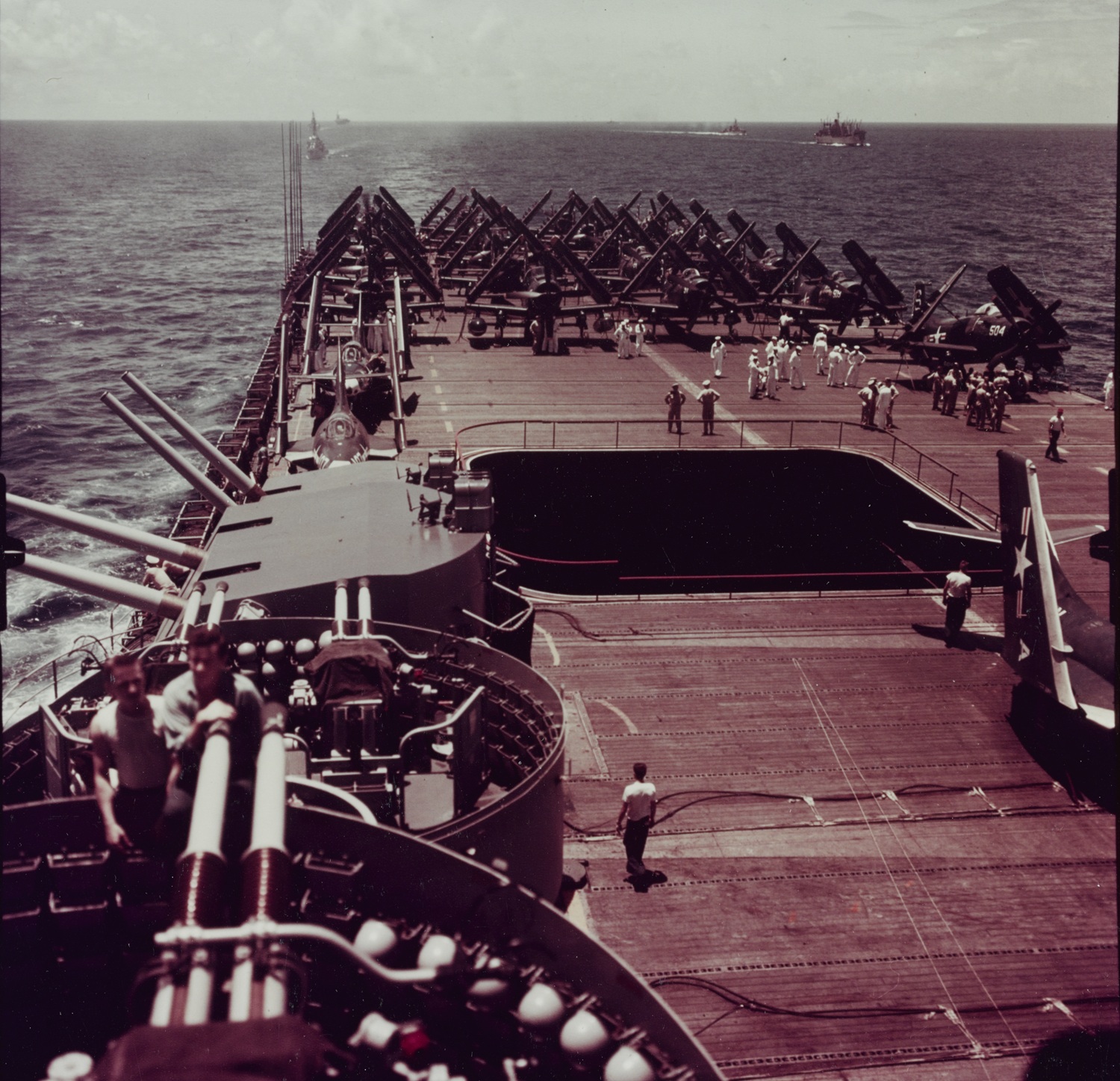 (Kodachrome) USS Philippine Sea (CVA-47) view looking aft from the carrier’s island, showing AD Skyraiders and F9F Cougars of ATG-2 parked on the flight deck. Photographed on 19 July 1955, while operating with the Seventh Fleet. Photographed by PH1 J.E. Cook. 80-G-K-18466