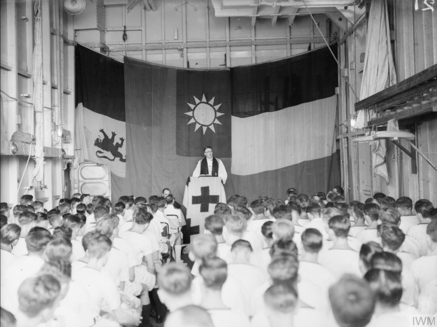The Bishop of Colombo preaching at Morning Service on board HMS Ceylon as she swings at anchor in the colony, 5 January 1944. Note the flags of Allies KMT China, Belgium, and France behind the pulpit. Photo by Trusler, C (Lt), IWM (A 21907)