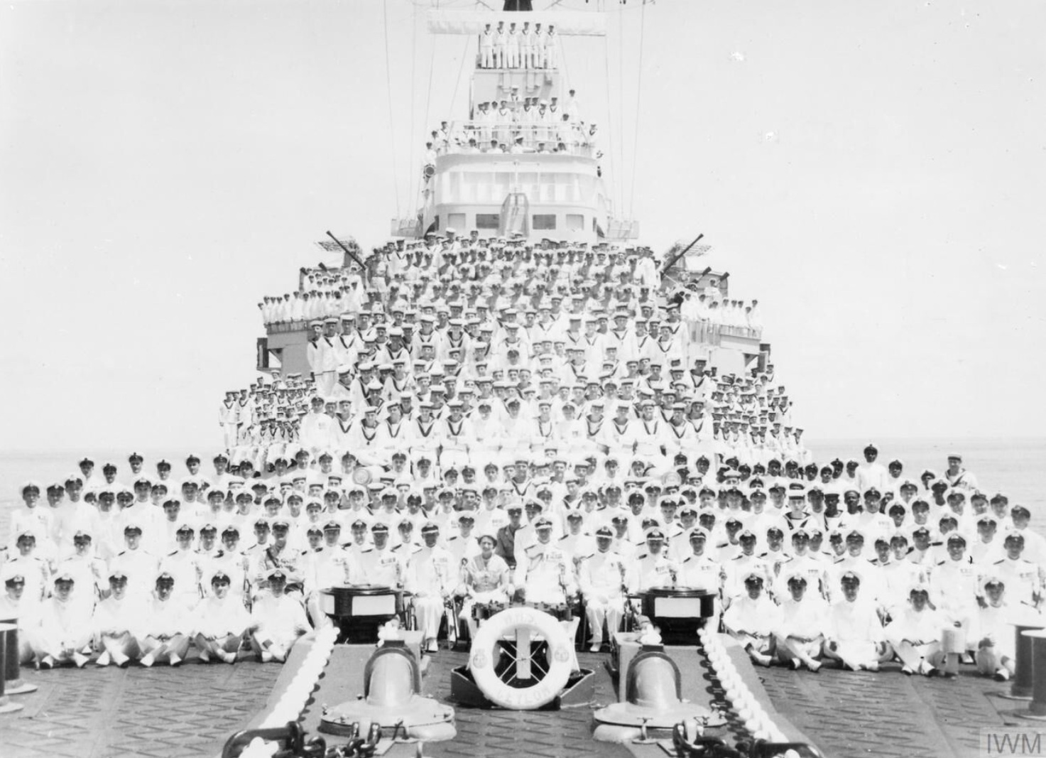 9 April 1954. Her Majesty the Queen and His Royal Highness the Duke of Edinburgh with the Captain, Officers and Ship’s Company of HMS Ceylon. Seated on the Fo`c’sle, left to right: Midshipman Grassby, RNVR, Tunbridge Wells; Midshipman A Khan, RPN, Pakistan; Midshipman Chitham, London; Midshipman Malek, RPN, Pakistan; Midshipman Z Khan, RPN, Pakistan; Midshipman Allen, Wimborne; Midshipman Day, Lydney, Glas; Midshipman Snow, S Africa; Midshipman Broomfield, Catterwick; Midshipman Steil, Uganda; Midshipman Suanders, Uganda. Seated front row: Lieut Bannister, Reigate; Lieut (S) North, Doncaster; Inst Lieut Cottam, London; Lieut Cdr Stewart, Ceylon; Lieut Cdr Cheetham. Hatch End, Middx; Captain R M Harris, Bickley, Kent; Commander (S) Mellor, Withington; Commander (E) Grill, Blechingly, Surrey; Captain Foster Brown, Liss; HM The Queen; HRH The Duke of Edinburgh; Cdr Steiner, London; Surg Cdr Hovendon, London; Cdr (L) Webber, Henfield; Lieut Cdr Haley, Bexhill on Sea; Lieut Cdr Leak, Liverpool. IWM (A 32922)