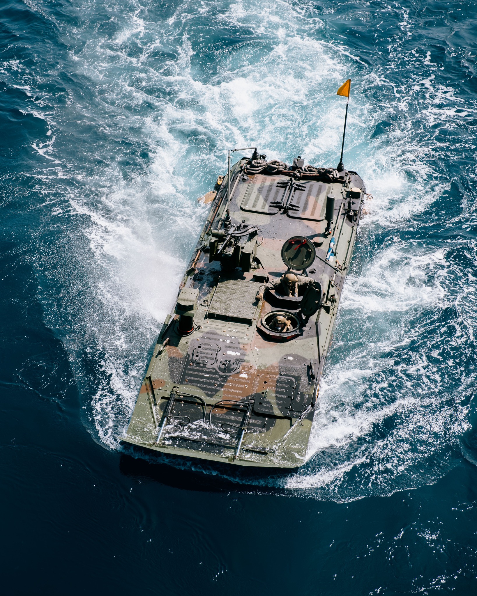 A U.S. Marine Corps amphibious combat vehicle with Battalion Landing Team 3/5, 11th Marine Expeditionary Unit, conducts an open-water transit prior to embarking the amphibious assault ship USS Boxer (LHD 4) in the Pacific Ocean, Sept. 14, 2025. Elements of the 11th MEU embarked Boxer to conduct integrated training off the coast of Camp Pendleton, California. (U.S. Marine Corps photo by Cpl. Joseph Helms)
