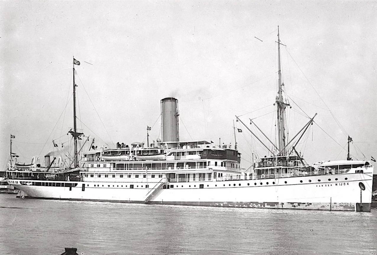 KPM liner SS Van der Wijck (BRT: 2596), built in 1921. The vessel capsized a few hours after departure from Soerabaja for Semarang with the loss of 58 lives. Investigations later pointed to improper ballast water transfers by inexperienced crew, exacerbated by open lower deck portholes, as the cause of the accident.