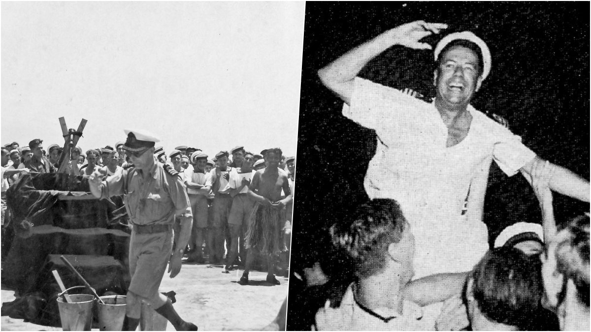 Neptune’s Day line crossing celebration aboard HNLMS Karel Doorman. Captain L.J. Goslings, first officer aboard HNLMS Karel Doorman, is in the middle with sunglasses, and is seen to the right with the crew. (NIMH 0018_101565)