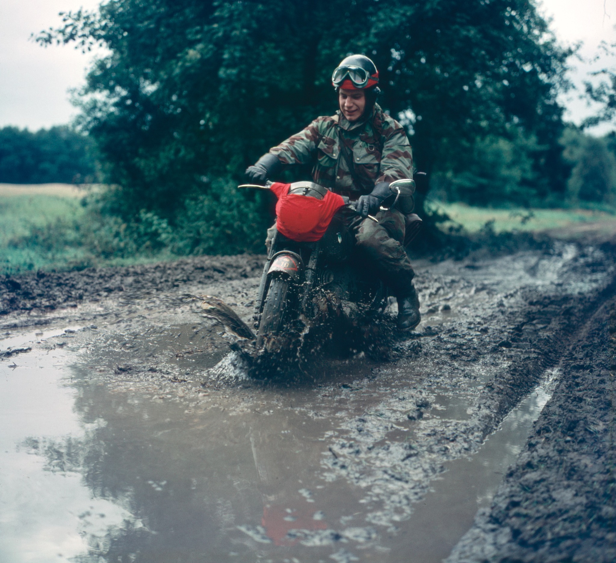 Kradmelder fährt mit seinem Motorrad vom Typ DKW RT 175 VS bei der Ausbildung durch unwegsames Gelände im Juni 1960. Altarchiv V-9 412555 3283