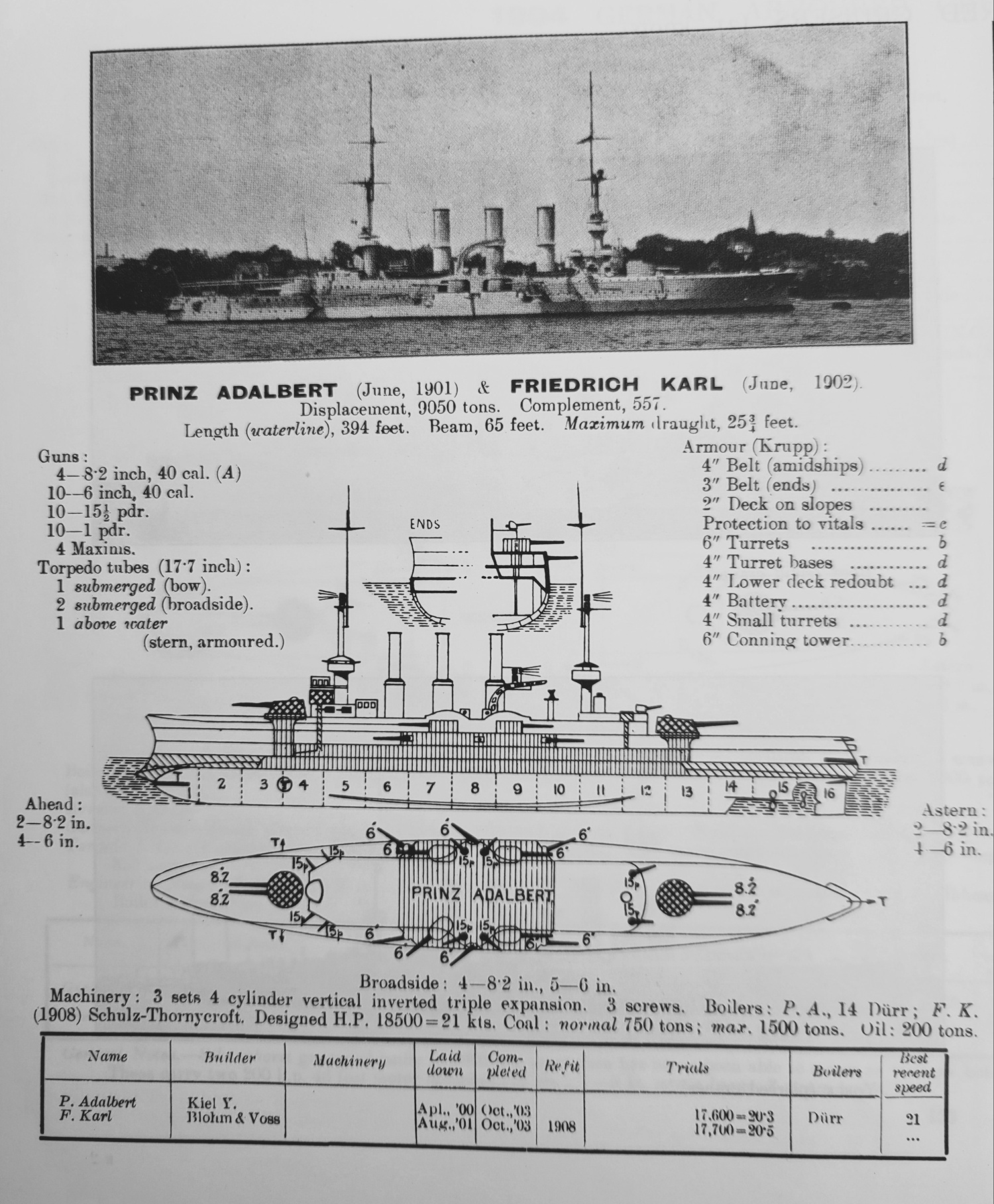 Prinz Adalbert Friedrich Karl Janes 14 Posted on November 18, 2025 by laststandonzombieisland Leave a comment Jane’s 1914 entry for the armored cruisers SMS Prinz Adalbert and Friedrich Carl. Previous Next Return to Warship Wednesday 19 November 2025: Pride of the Scouting Group