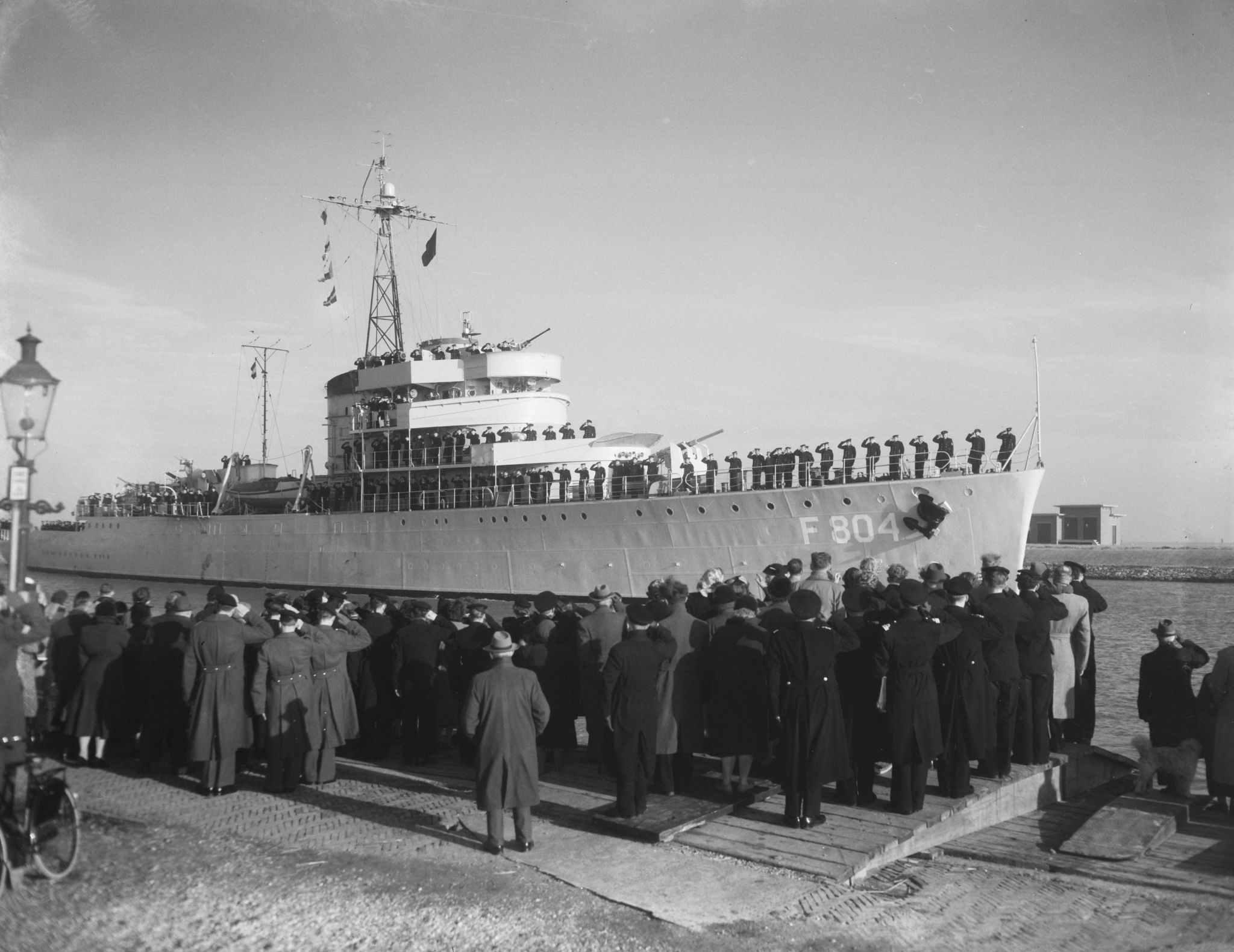 Hr. Ms. Van Kinsbergen na 3 jaar uit Nieuw Guinea weer te Den Helder, Feb 4 1955 Bestanddeelnr 906-9672