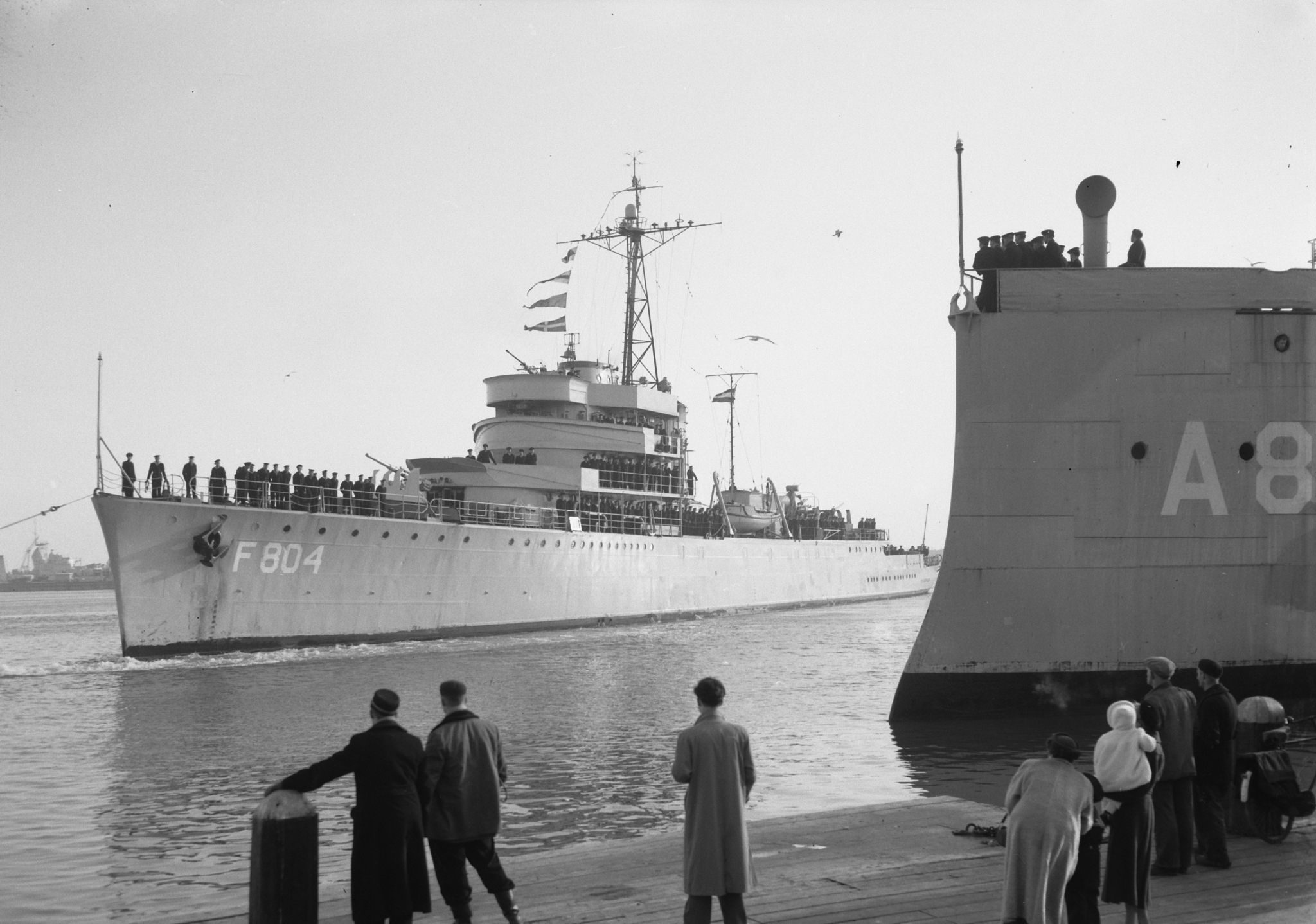 Hr. Ms. Van Kinsbergen na 3 jaar uit Nieuw Guinea weer te Den Helder, Feb 4 1955 Bestanddeelnr 906-9673