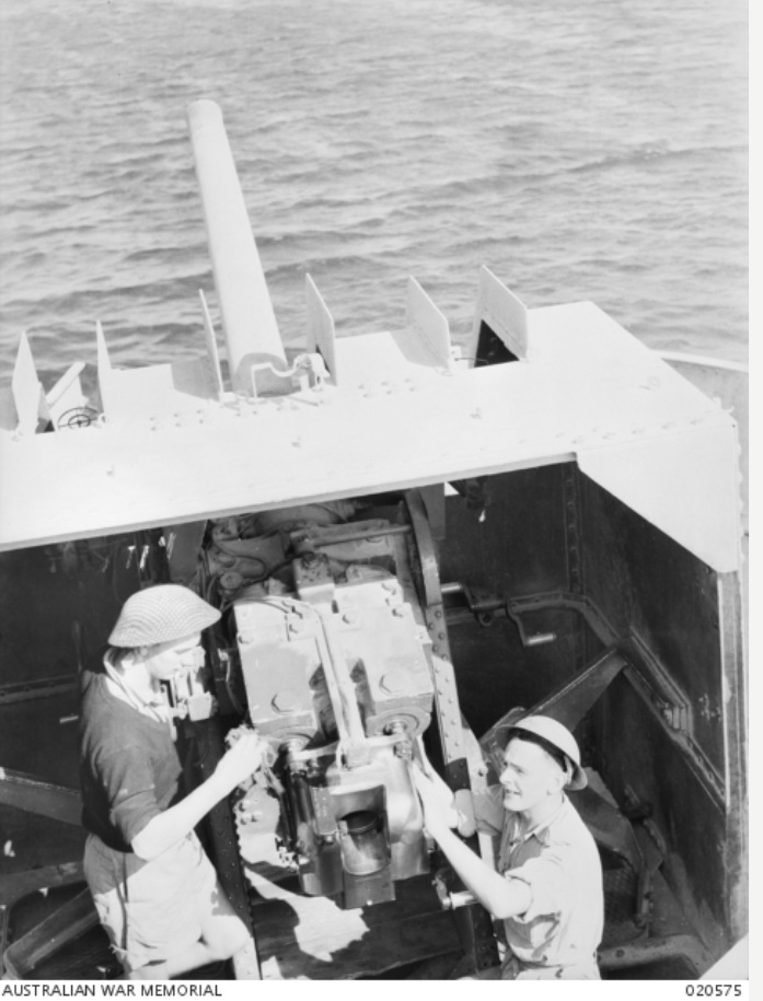 5 September 1941. Gunners of No 40 Battery, 14th Light Anti-Aircraft Regiment, Royal Artillery, cleaning a gun on board the half-submerged HMS Ladybird, which was sunk by enemy bombs in Tobruk Harbour. Photo by Thomas Fisher. AWM 020575