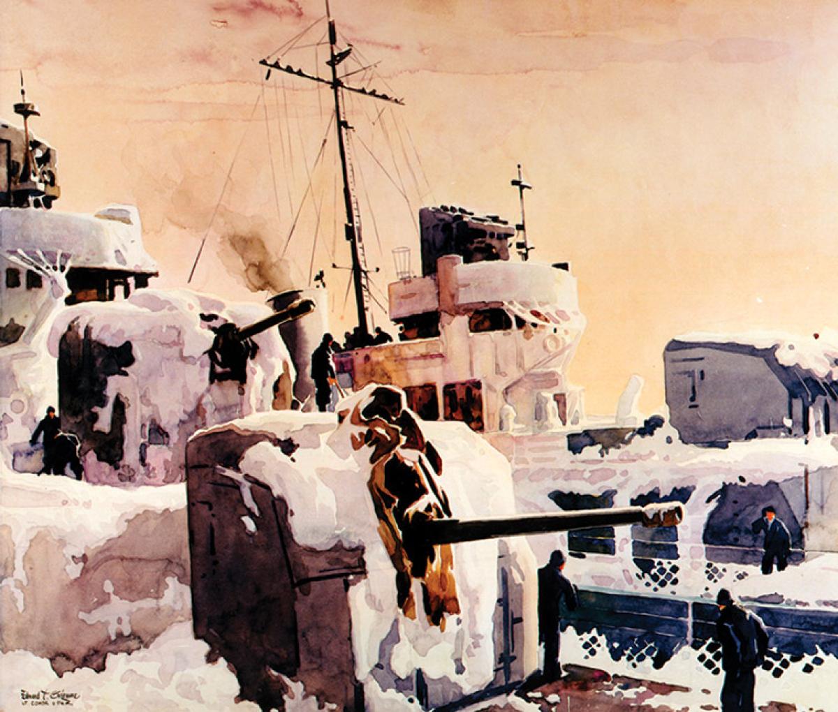 Grigware 07-805-p Posted on December 15, 2025 by laststandonzombieisland Leave a comment Painting, Watercolor on Paper; by Edward T. Grigware; 1943; Framed Dimensions 16H X 18W. Naval History and Heritage Command Accession #: 07-805-P Return to Fletcher snowballs
