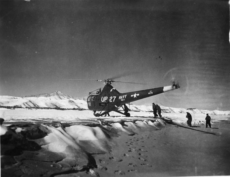 The USS Manchester’s helicopter, nicknamed the Clementine, lands on the snow-covered beach at Kisamun Dan, Korea. A rescue mission was launched after the HTMS Prasae, a Thai Corvette, ran aground on Korea’s Eastern Coast during a blizzard. Original caption: With the temperature at 12 degrees below zero, the last of Commander Vudhichae’s crew are evacuated. NARA 350892786