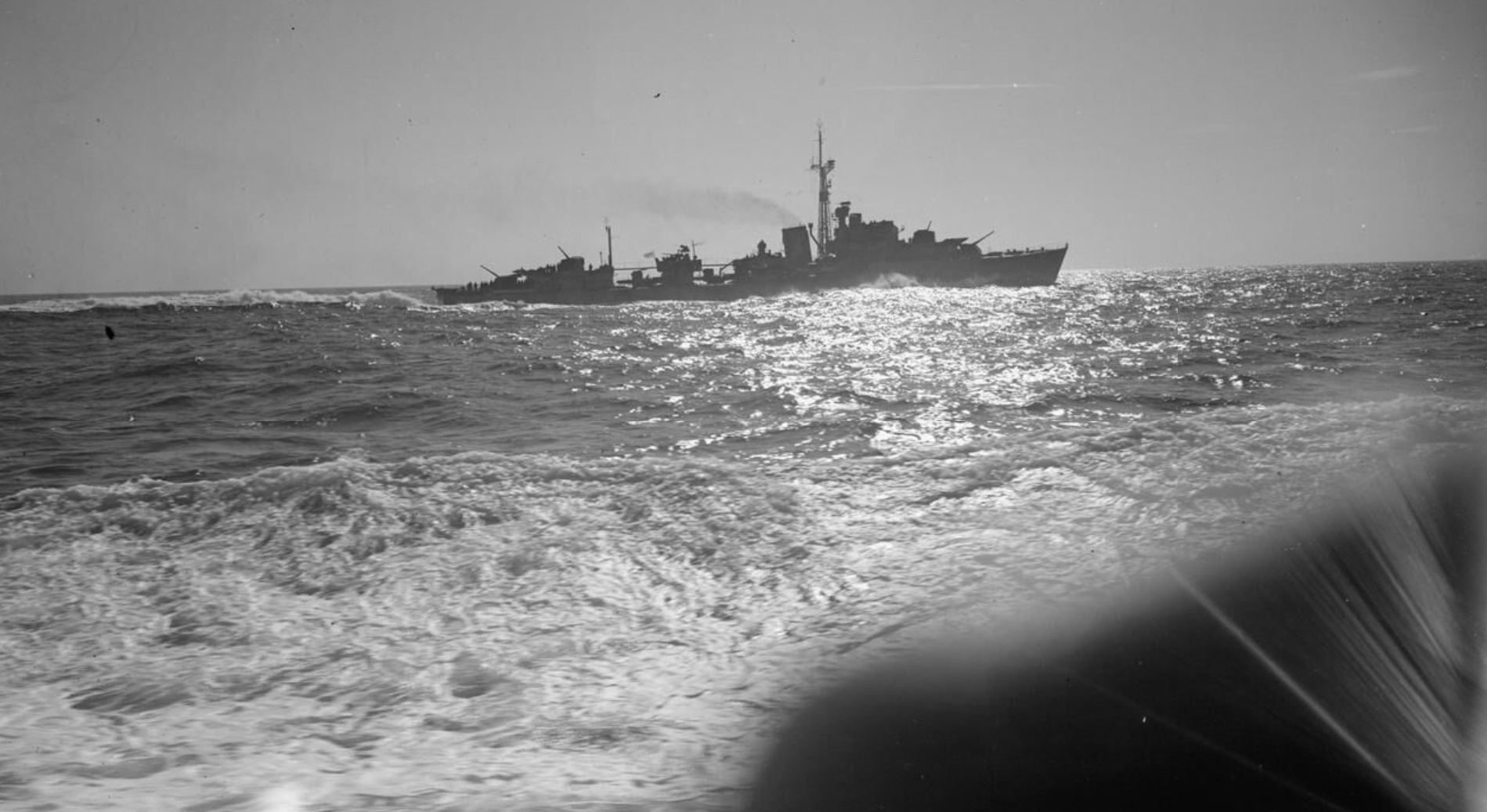 The Navy lands supplies in Normandy, 13 June 1944, on board HMS Kelvin during Mr. Churchill’s crossing to France. At 30 knots in the Channel, HMS Scourge is seen from the destroyer HMS Kelvin. Photo by LT CH Parnall, RN, IWM A 24090.