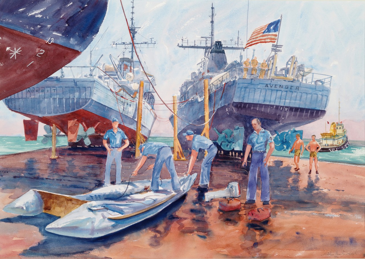 “Inflation of Zodiac. USS Adroit and USS Avenger wait on the deck of the Dutch ship Superservant to be floated off and begin minesweeping operations. The crew in the lightweight zodiac will knock out bilge blocks and props supporting the minesweepers as they are refloated.” Painting, Watercolor on Paper; by John Charles Roach; 1991; Framed Dimensions 30H X 39W. NHHC Accession #: 91-049-O.