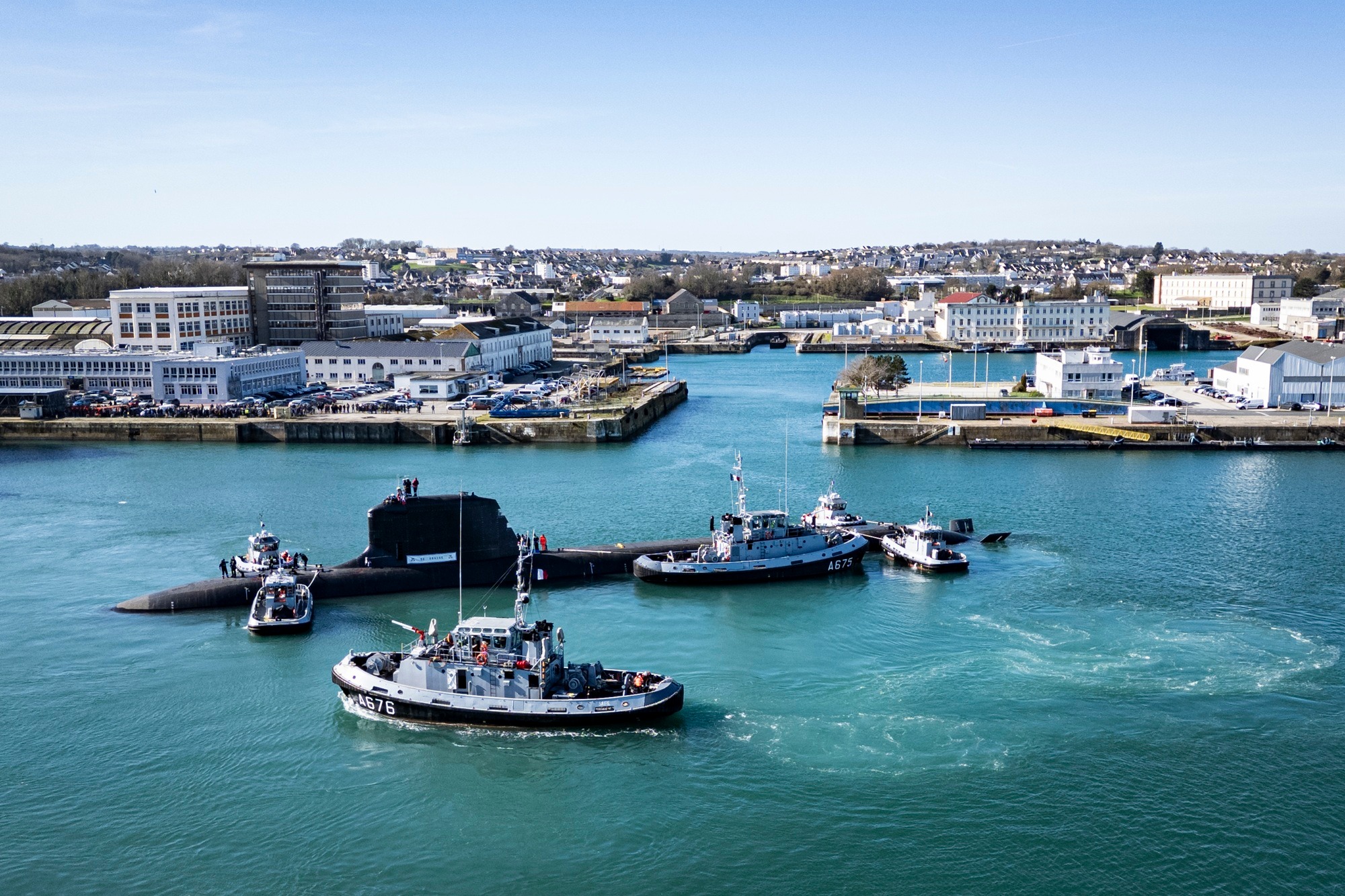 Le Mardi 24 Février 2026 à Cherbourg-en-Cotentin. Prises de vues au drone de la sortie du SNA De Grasse.