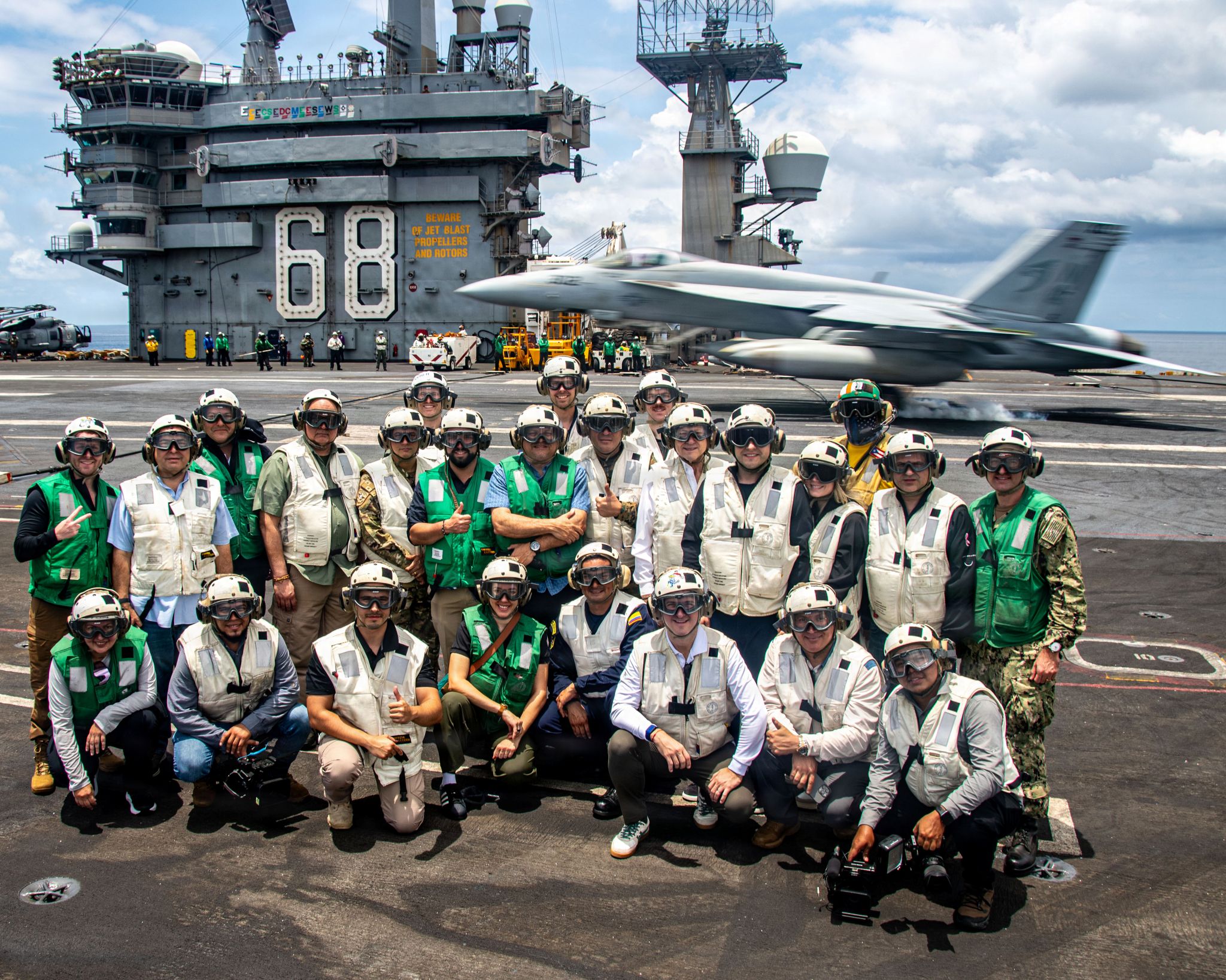 Panamanian distinguished visitors and U.S. Embassy Panama personnel pose for a photo during flight operations on the flight deck of Nimitz-class aircraft carrier USS Nimitz (CVN 68) in the Pacific Ocean, March 28, 2026. (U.S. Navy photo by Mass Communication Specialist 2nd Class Jaron Wills)