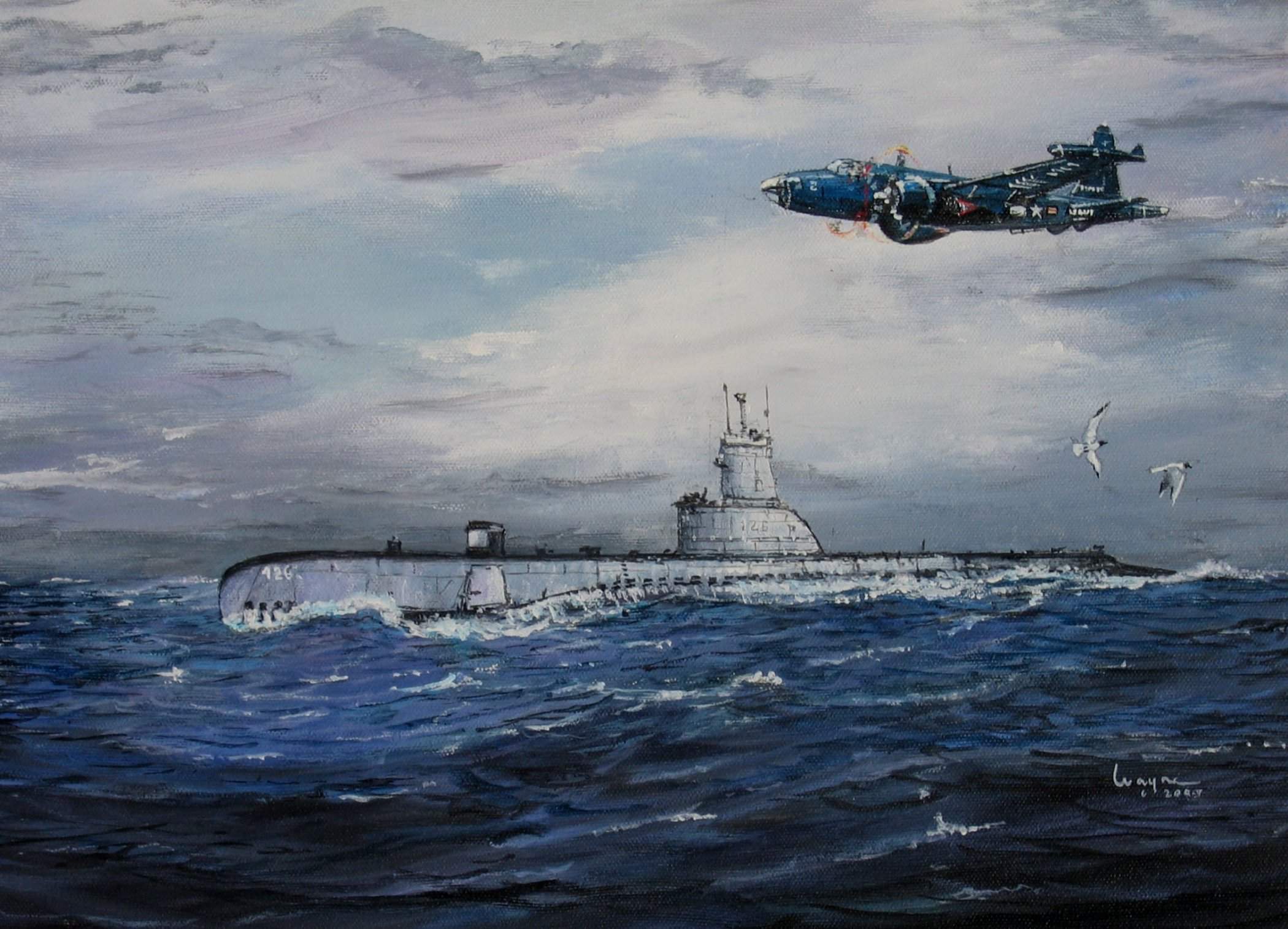 “Cat and Mouse” by Wayne Scarpaci shows the USS Tusk (SS-426) with a Lockheed (P2V) Neptune flying overhead in ASW training.